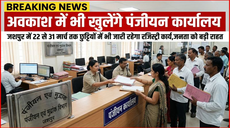 जशपुर : पंजीयन विभाग ने राजस्व संग्रह को ध्यान में रखते हुए महत्वपूर्ण निर्णय लिया है। मार्च माह के अंत में आने वाले शासकीय अवकाश के दिनों में भी पंजीयन कार्यालय खुले रहेंगे। कार्यालय महानिरीक्षक पंजीयन एवं अधीक्षक मुद्रांक, रायपुर ने इस संबंध में आदेश जारी किया है।