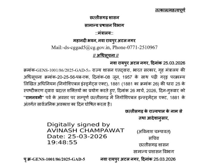 रायपुर : छत्तीसगढ़ सरकार ने रामनवमी के पावन पर्व के अवसर पर राज्यभर में सार्वजनिक अवकाश घोषित करते हुए एक महत्वपूर्ण अधिसूचना जारी की है। सामान्य प्रशासन विभाग द्वारा जारी आदेश के अनुसार 26 मार्च 2026 (गुरुवार) को पूरे राज्य में अवकाश रहेगा। यह निर्णय प्रदेशवासियों की आस्था, परंपरा और सांस्कृतिक महत्व को ध्यान में रखते हुए लिया गया है।