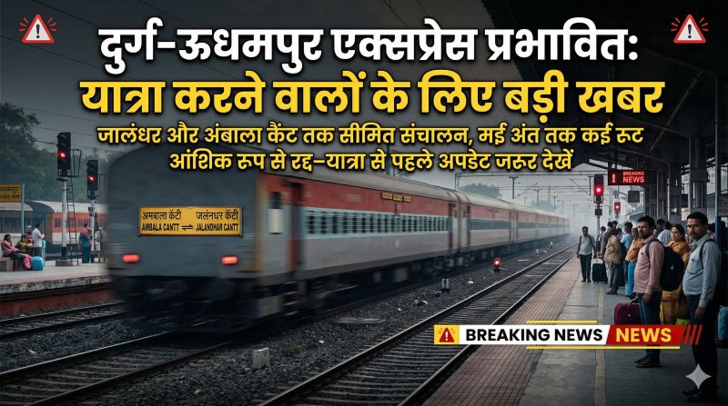 👉 दिनाँक 27 मई 2026 तक दुर्ग से चलने वाली गाड़ी संख्या 20847 दुर्ग-शहीद कप्तान तुषार महाजन ऊधमपुर एक्सप्रेस, अंबाला कैंट स्टेशन में समाप्त होगी तथा अंबाला कैंट-शहीद कप्तान तुषार महाजन ऊधमपुर के मध्य रद्द रहेगी ।