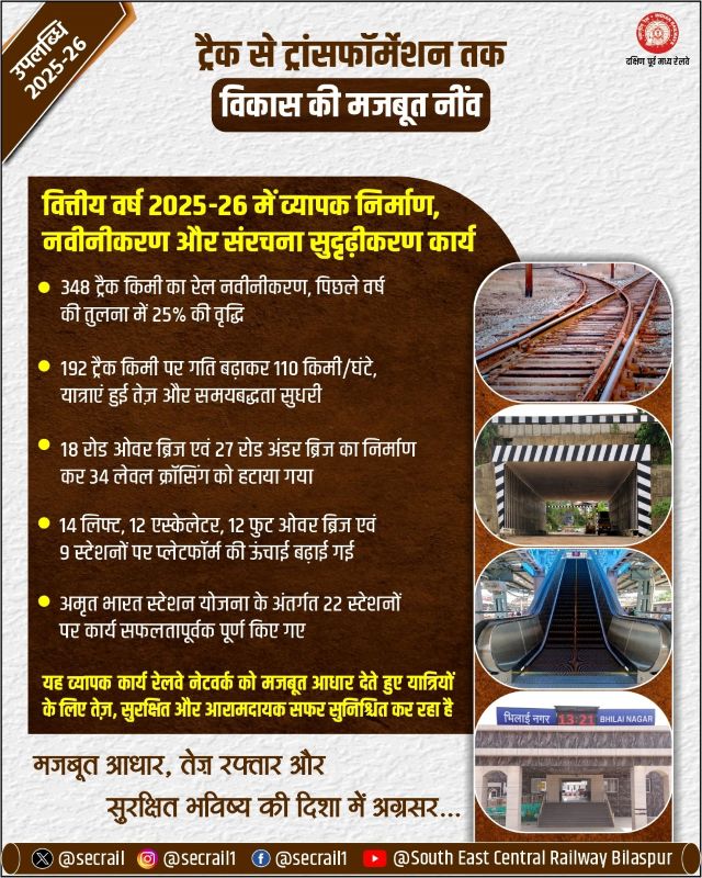 बिलासपुर : रेलवे नेटवर्क की मजबूती उसकी पटरियों, पुलों और आधारभूत संरचना पर निर्भर करती है। वित्तीय वर्ष 2025–26 के दौरान दक्षिण पूर्व मध्य रेलवे के सिविल इंजीनियरिंग विभाग ने व्यापक स्तर पर अनुरक्षण, निर्माण एवं आधुनिकीकरण कार्य करते हुए न केवल भौतिक ढांचे को सुदृढ़ किया, बल्कि यात्रियों एवं आम नागरिकों के जीवन को भी अधिक सुरक्षित और सुगम बनाया है। यह उपलब्धियाँ रेलवे के सतत विकास और जनसेवा के प्रति उसकी प्रतिबद्धता को स्पष्ट रूप से दर्शाती हैं।
