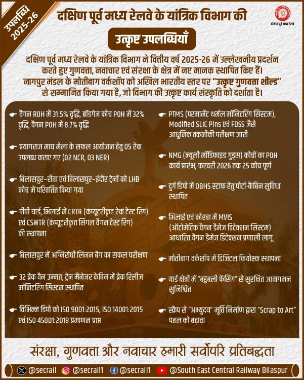 बिलासपुर : दक्षिण पूर्व मध्य रेलवे (SECR) के यांत्रिक विभाग ने वित्त वर्ष 2025-26 में उत्कृष्ट प्रदर्शन करते हुए कई महत्वपूर्ण उपलब्धियाँ हासिल की हैं । नागपुर रेल मंडल के मोतीबाग वर्कशॉप को अखिल भारतीय स्तर पर भारतीय रेलवे की सर्वश्रेष्ठ कार्यशाला घोषित कर “उत्कृष्ट गुणवत्ता शील्ड” से सम्मानित किया गया ।