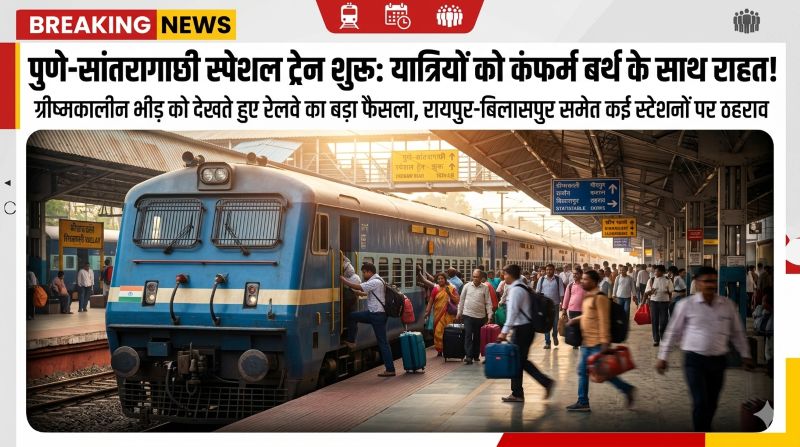 👉 गाड़ी संख्या 01429 पुणे- सांतरागाछी स्पेशल ट्रेन, पुणे से दिनांक 15 एवं 22 अप्रैल 2026 प्रत्येक बुधवार को सुबह 10.00 बजे रवाना होगी तथा मार्ग के अन्य मध्यवर्ती स्टेशनों से होते हुये दूसरे दिन गोंदिया आगमन 04.08 बजे, प्रस्थान 04.10 बजे, दुर्ग आगमन 06.10 बजे, प्रस्थान 06.15 बजे, रायपुर आगमन 06.50 बजे, प्रस्थान 06.55 बजे, बिलासपुर आगमन 08.45 बजे, प्रस्थान 09.00 बजे तथा मार्ग के अन्य मध्यवर्ती स्टेशनों से होते हुये 21.00 बजे सांतरागाछी स्टेशन पहुंचेगी |