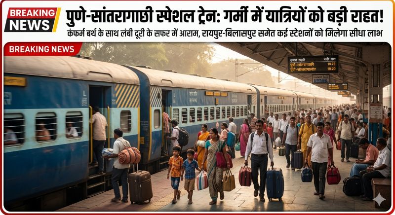 बिलासपुर : ग्रीष्मकालीन के दौरान ट्रेनों में यात्रियों की होने वाली अतिरिक्त भीड़ को ध्यान में रखते हुये उन्हें कंफ़र्म बर्थ के साथ यात्रा सुविधा उपलब्ध कराने हेतु पुणे- सांतरागाछी–पुणे के मध्य 02-02 फेरे के लिए स्पेशल ट्रेन का परिचालन किया जा रहा है ।