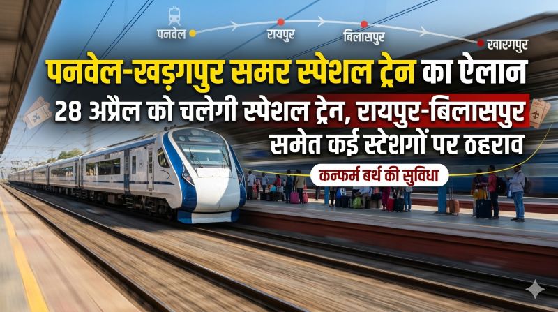 गाड़ी संख्या 01123 पनवेल-खड़गपुर समर स्पेशल ट्रेन पनवेल से दिनाँक 28 अप्रैल 2026 को चलेगी | इस गाड़ी का वाणिज्यिक ठहराव दक्षिण पूर्व मध्य रेलवे के गोंदिया, दुर्ग, रायपुर एवं बिलासपुर स्टेशनों में दिया गया है |