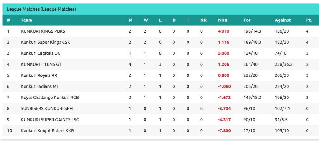 इसके बाद मैच नंबर 9 में Kunkuri Titans (GT) और Kunkuri Challengers (RCB) के बीच मुकाबला खेला गया, जिसमें RCB ने बेहतरीन खेल का प्रदर्शन करते हुए 6 विकेट से जीत अपने नाम की। टाइटन्स की टीम पहले बल्लेबाजी करते हुए 72 रन ही बना सकी, जो इस तेज फॉर्मेट में एक छोटा स्कोर साबित हुआ। लक्ष्य का पीछा करते हुए RCB ने संयम और आक्रामकता का संतुलन दिखाते हुए 8.2 ओवर में ही मैच खत्म कर दिया। इस मुकाबले में प्रवीप के. नांदे ने 22 गेंदों में 37 रन की शानदार पारी खेलकर टीम की जीत में अहम भूमिका निभाई और मैन ऑफ द मैच बने। नितीश कुमार गुप्ता ने भी 29 रन बनाकर टीम को मजबूती दी। गेंदबाजी में प्रतीक ने 3 विकेट लेकर विपक्ष की कमर तोड़ दी, जबकि सोनू चौहान ने 2 विकेट लेकर अच्छा सहयोग दिया।