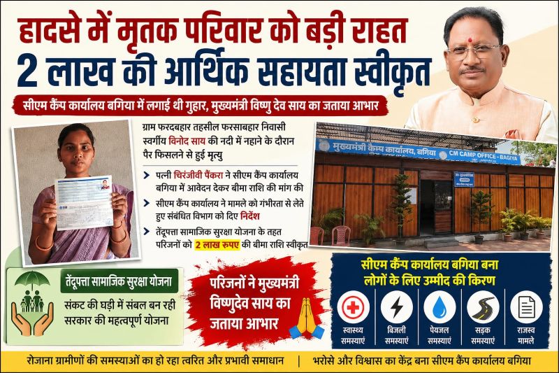 हादसे में मृतक परिवार को बड़ी राहत: 2 लाख की आर्थिक सहायता स्वीकृत, सीएम कैंप कार्यालय बगिया में लगाई थी गुहार, परिजनों ने मुख्यमंत्री विष्णुदेव साय का जताया आभार