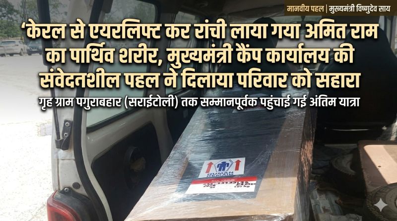 मुख्यमंत्री कैंप कार्यालय ने मामले की गंभीरता को देखते हुए तत्काल आवश्यक समन्वय स्थापित किया। इसके परिणामस्वरूप अमित राम के पार्थिव शरीर को विमान के माध्यम से केरल से रांची तक लाया गया। इसके पश्चात मुक्तांजली वाहन के जरिए उन्हें उनके गृह ग्राम पगुराबहार(सराईटोली) पहुंचाया गया। किसी प्रियजन की असमय मृत्यु परिवार के लिए अत्यंत पीड़ादायक होती है, विशेषकर जब यह घटना घर से दूर घटित हो। ऐसे समय में पार्थिव शरीर को शीघ्र घर लाना परिजनों की सबसे बड़ी आवश्यकता होती है। मुख्यमंत्री कैंप कार्यालय द्वारा की गई इस त्वरित एवं मानवीय पहल ने शोकाकुल परिवार को बड़ी राहत और मानसिक संबल प्रदान किया है।