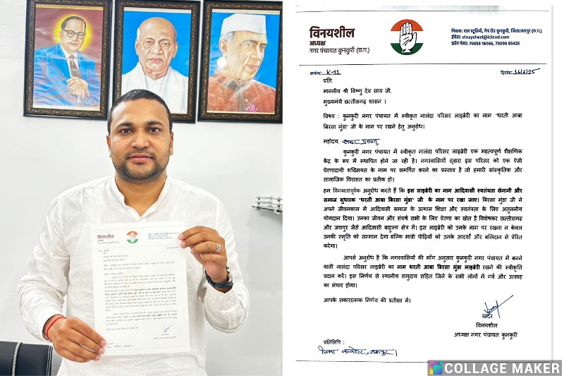 कुनकुरी | 16 जून 2025 : कुनकुरी नगर पंचायत के अध्यक्ष विनयशील द्वारा मुख्यमंत्री छत्तीसगढ़ श्री विष्णु देव साय को एक महत्वपूर्ण पत्र भेजा गया है, जिसमें नगर पंचायत क्षेत्र में स्वीकृत नालंदा परिसर लाइब्रेरी का नाम “धरती आवा बिरसा मुंडा” रखने की मांग की गई है। यह पहल न केवल एक सांस्कृतिक सम्मान की दृष्टि से महत्वपूर्ण है, बल्कि यह आदिवासी समाज की ऐतिहासिक पहचान और संघर्ष को नई पीढ़ी तक पहुंचाने की एक प्रेरणास्पद कोशिश मानी जा रही है। पत्र में विनयशील ने उल्लेख किया है कि कुनकुरी…